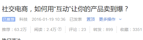 最后就是有利性。除了能夠引起用戶情緒的東西容易獲得傳播以后,還有就是對于用戶有利的東西,也會讓目標用戶愿意收藏轉發。比如我的一篇文章《社交電商,如何用“互動”讓你的產品賣到爆》,在今日頭條上,獲得了899個轉發,3351個收藏。